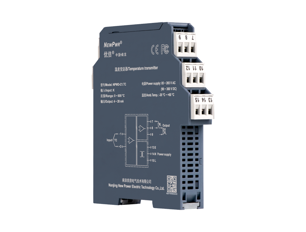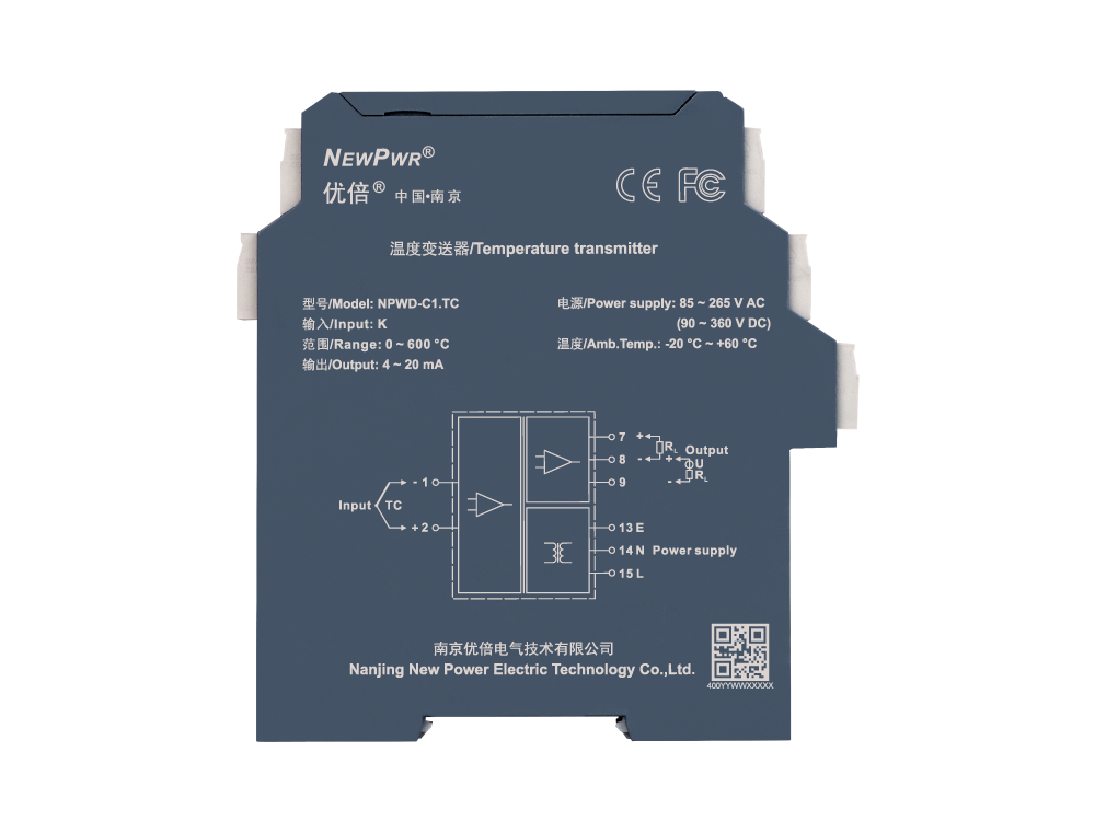 This temperature transmitter converts the thermocouple signals to 4~20mA signals. It needs an independent power supply. The input, output, and power supply are galvanically isolated from each other. Calibrate the apparatus or modify parameters by using a handheld programmer.